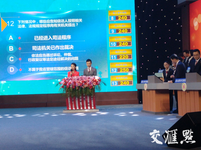 交汇点讯 “光明市光明区光明镇的王大爷,走进信访接待大厅,反映自己的诉求……”一段反映群众上访过程的视频,接受52名江苏信访业务骨干“挑刺”。一个个错误得到纠正,台下观众报以一阵阵热烈掌声。 2017年12月26日,江苏省信访业务“大练兵大比武”竞赛在南京举行。这是江苏首次举行全省信访系统的业务大比拼。竞赛活动包括书面考试和现场答题,各设区市信访系统均派出代表队一展身手。交汇点记者现场观赛发现,题目紧扣服务信访群众,“大比武”意在规范信访基础业务,增强信访干部履职能力。